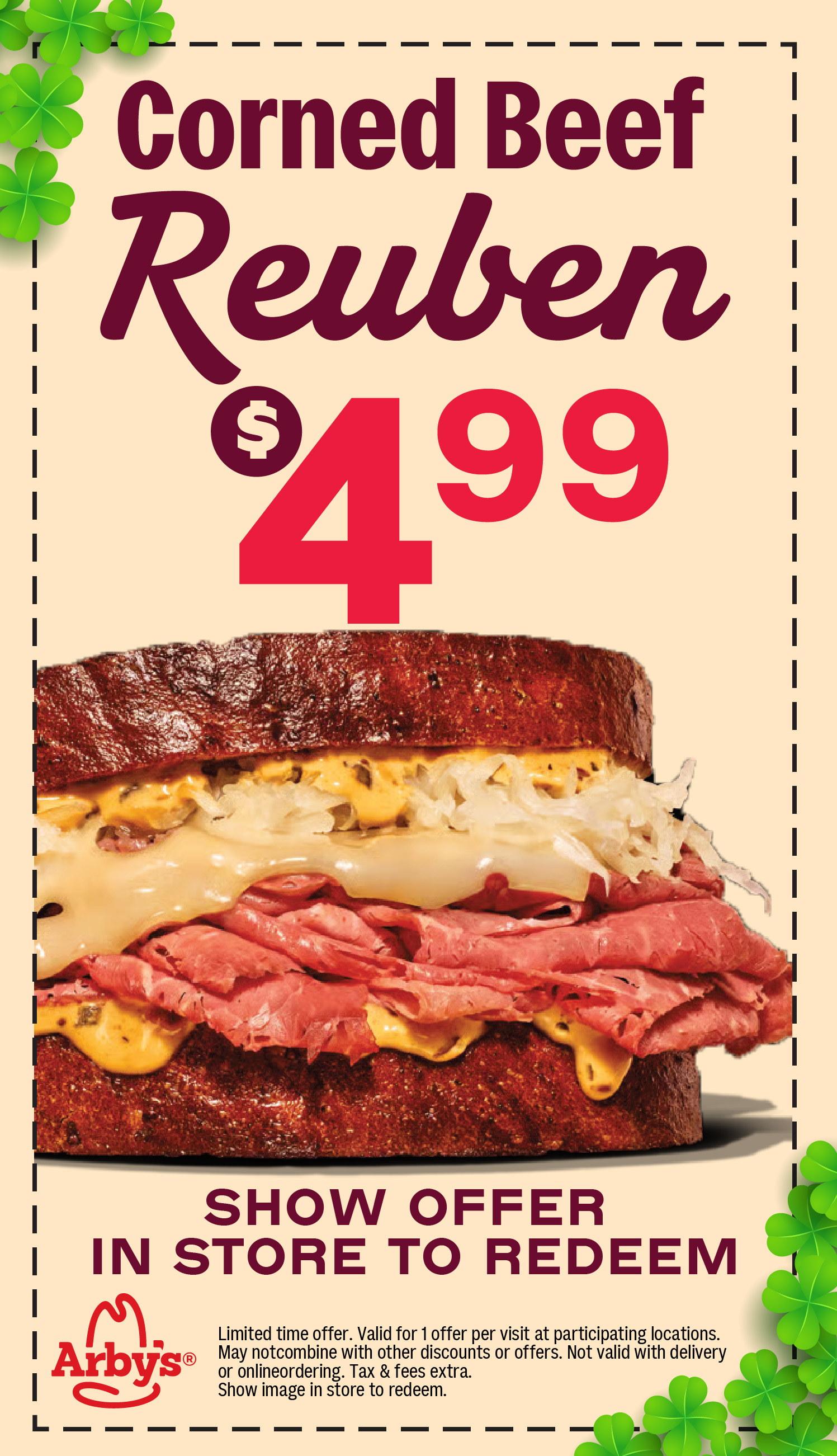 Coupon only valid for one use per visit at participating Arby's while supplies last. Not valid with any other offer, discount, or coupon. Not valid with delivery or online ordering. Offer Ends 03/18/26.